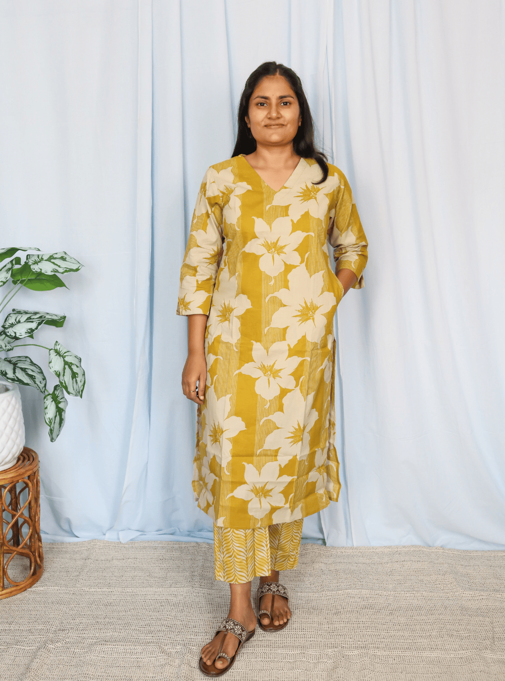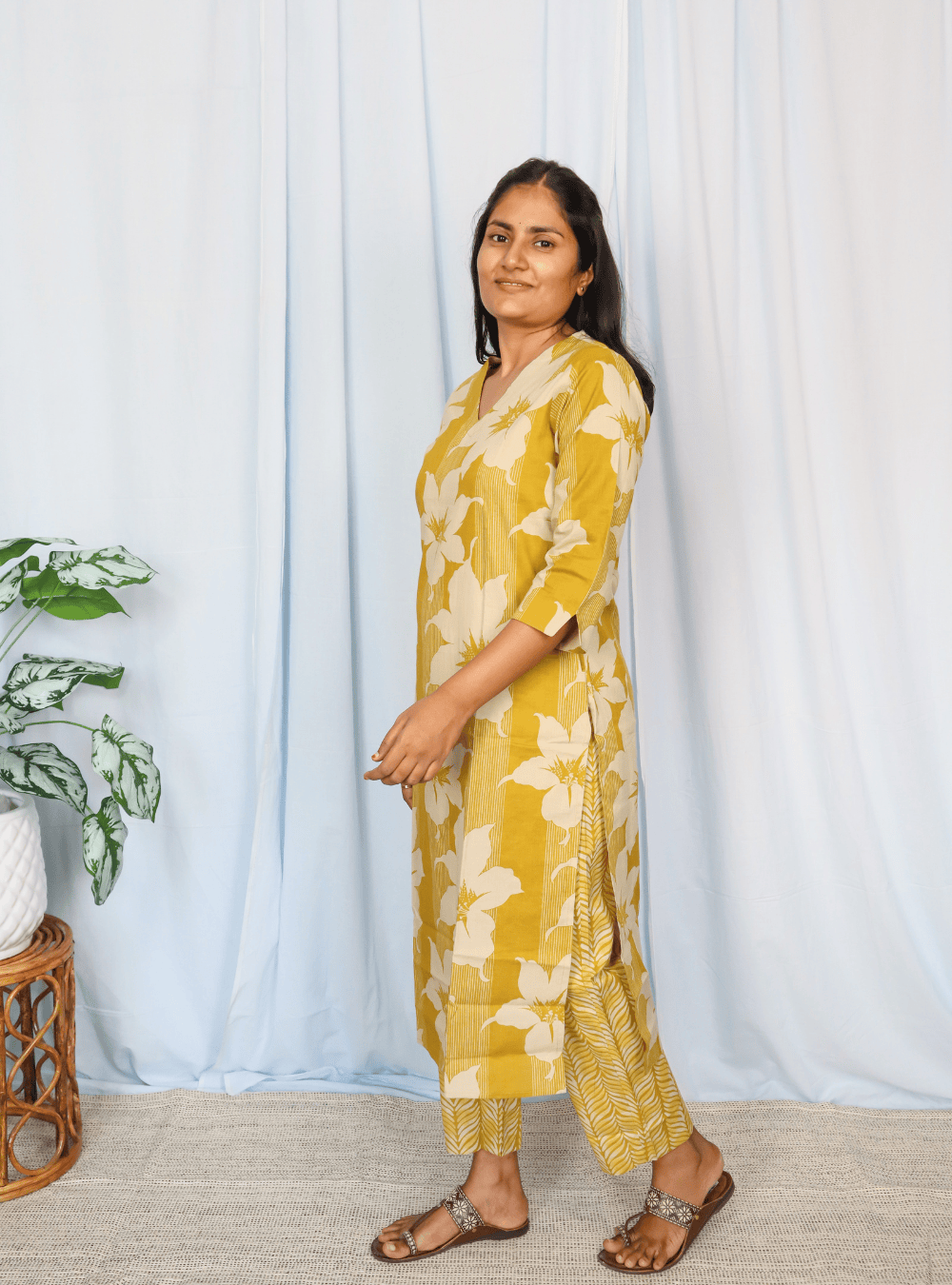 Yellow Floral Print Cotton kurta Set