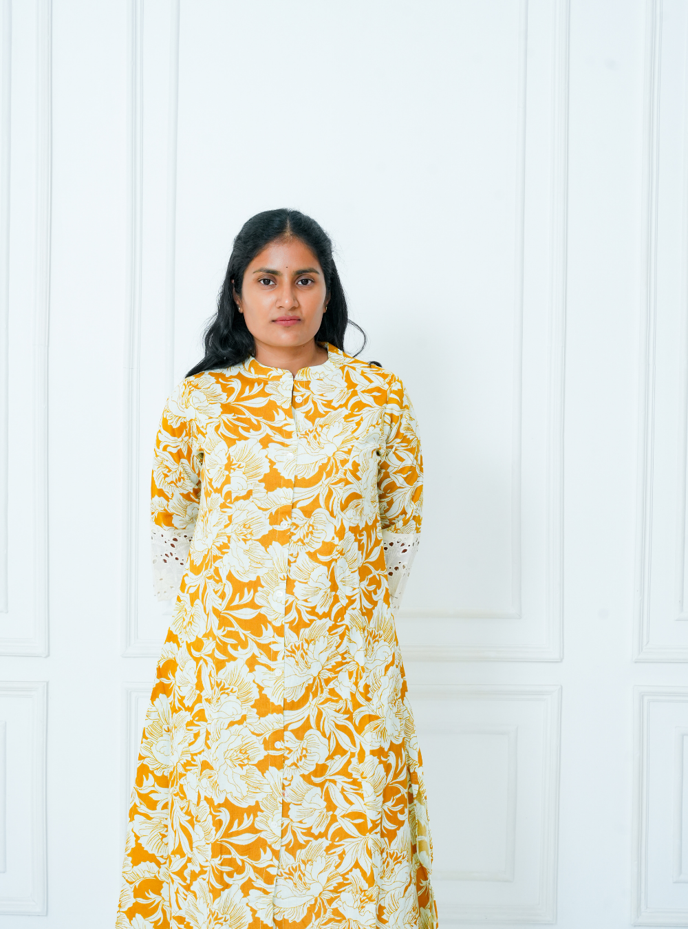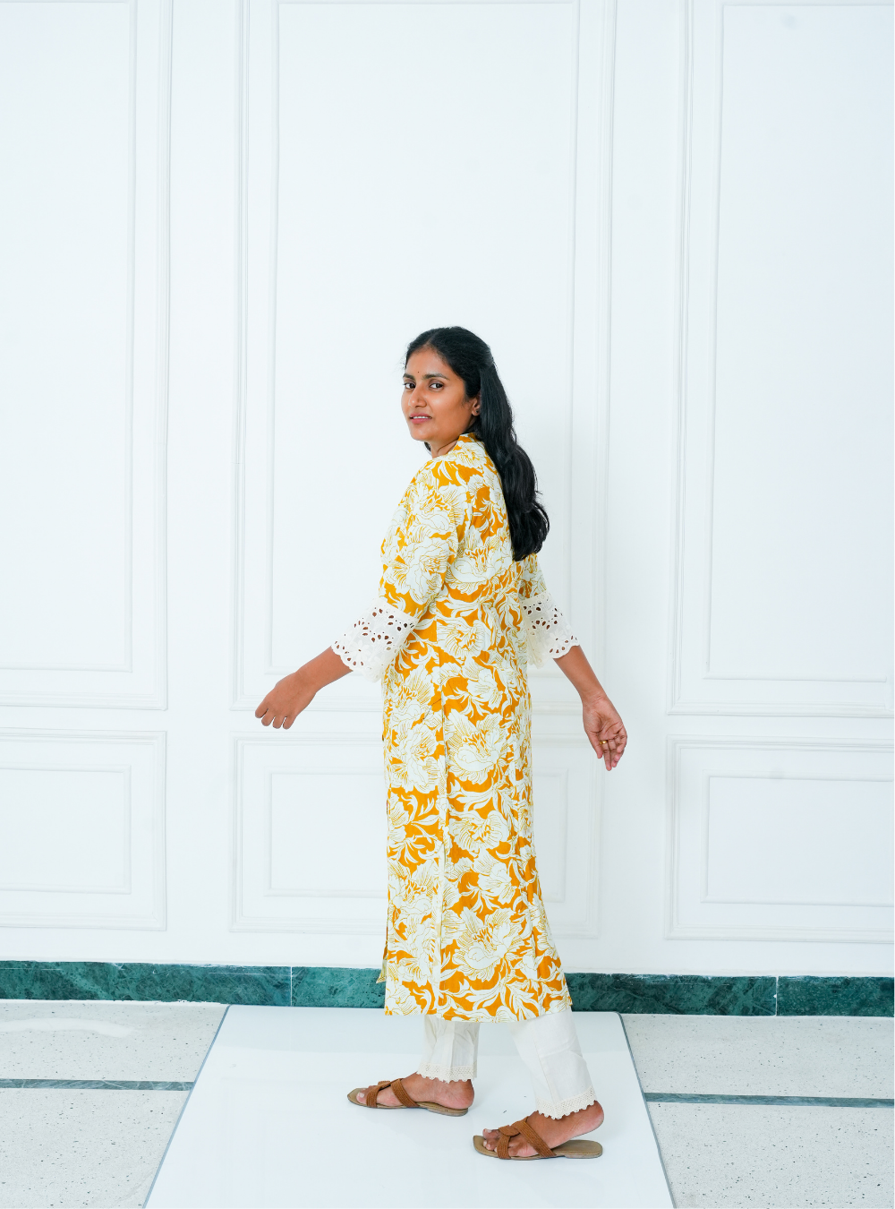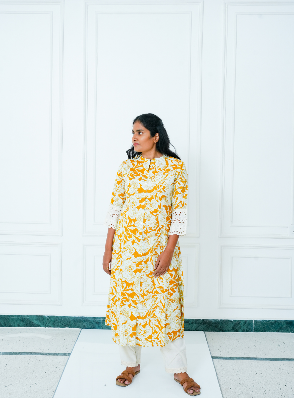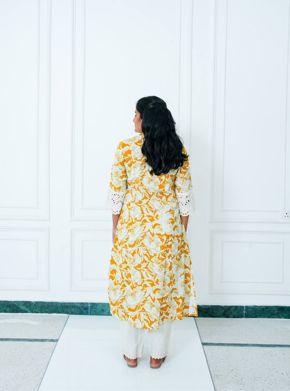 Yellow floral print Chinese collared flex cotton kurta with white pants